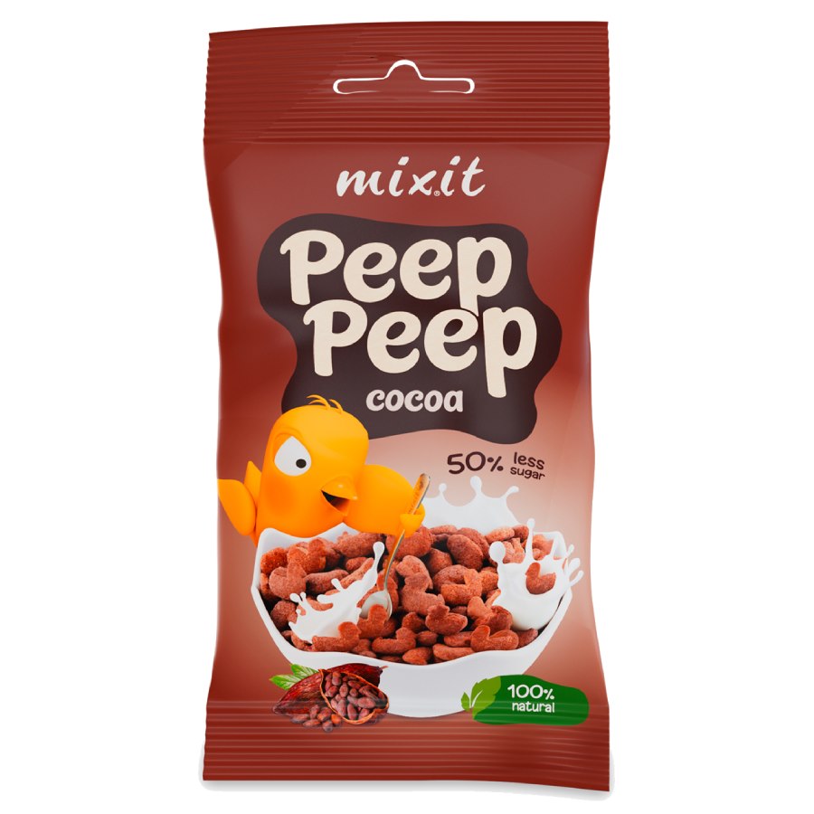 Nüüd on meil kakaoga hommikusöögihelbed praktilises ja taskukohases pakendis! Meie Mixiti helbed sisaldavad 50% vähem suhkrut kui sarnased tooted ja oleme neid magustanud datlisiirupiga, mis on väärtuslik magneesiumiallikas. Need sisaldavad ka rohkelt kiudaineid, et teie kõht oleks nagu taevas. Linnu kujuga padjakesed on valmis äratama isegi kõige pisemad unepead.
